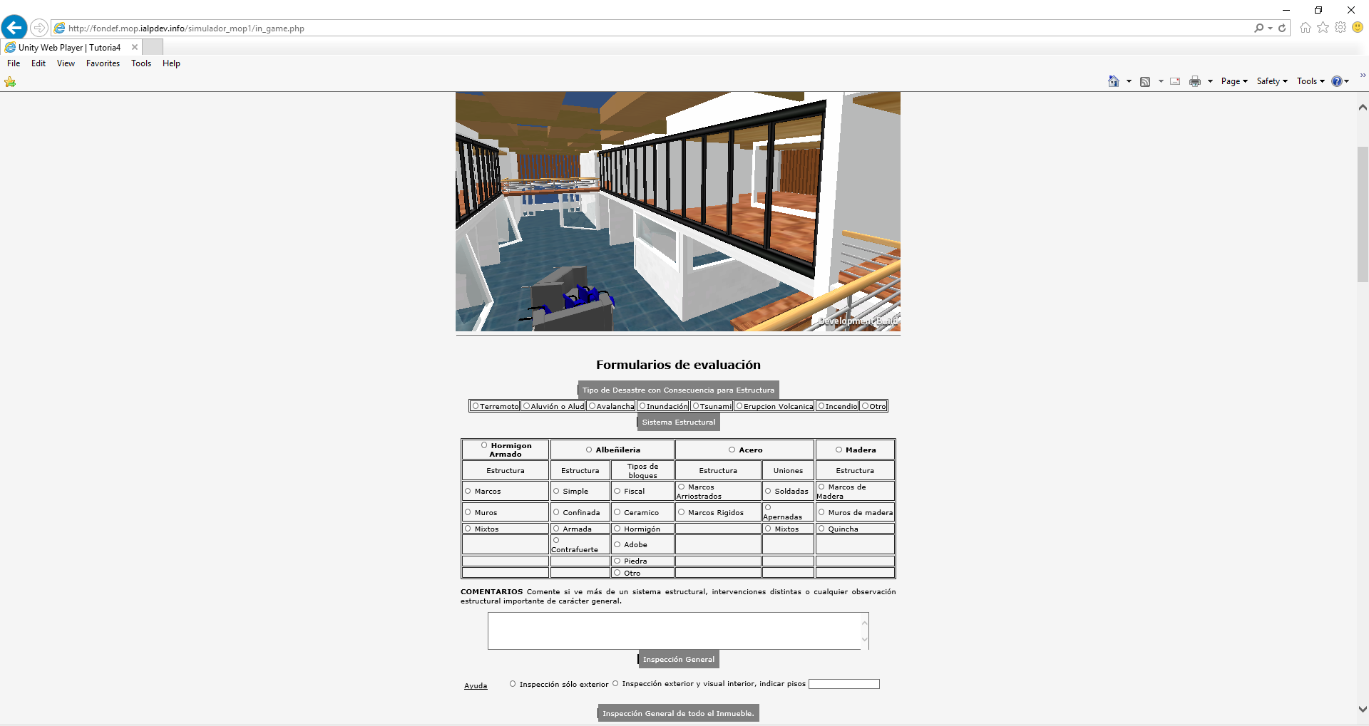 This prototype has been built to develop a competence among trainees that: a) aids to make decisions on habitability and reparability of CPI affected by disasters like earthquakes; b) the trainee can gather the CPI data while navigating through the virtual CPI; c) facilitates training, debriefing, and correction of trainees learning by putting together trainee and expert; and d) allows to classify a CPI based on the world-wide used traffic model for safety and structural stability assessment of the CPI. The serious video game-based simulator development was tested an evaluated by structural engineering experts, general engineers, and managers, from the Academy Office from Chilean Department of Transportation (MOP). Experts were given a demonstration of the prototype, focusing on what the system was able to achieve, how the system needed to used, what were the response times from the system for the different operations allowed for both; trainee and expert/moderator roles, and what was the underlying architecture of the system. Experts and managers from MOP Academia also have expressed qualitatively that they anticipate this type of technology represents a real opportunity to further develop a national standard capability on early and quick safety and structural stability assessment. This opinion has been expressed in terms of perceiving that this technology provides easy access to practitioners, online web-based platform; easy to learn and use system; standard web-based technology with video-game being a technology that most young adults are familiar with; and enables different teaching/training/learning methodologies to be incorporated into the simulation platform.